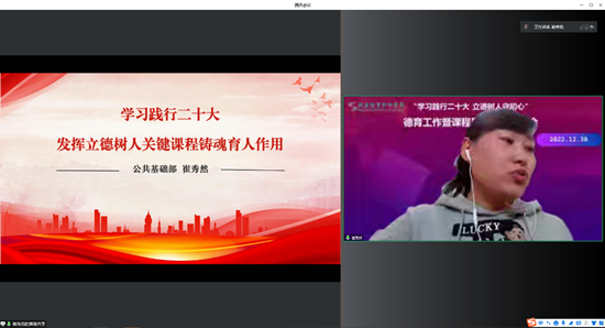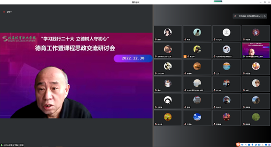为贯彻落实习近平总书记在学校思想政治理论课教师座谈会上的重要讲话精神和党的二十大报告中关于教育的重要论述精神,全面落实立德树人根本任务,推动我院德育工作和课程思政工作创新发展,全面提升人才培养质量。2022年12月30日学院以线上会议形式召开“学习践行党的二十大立德树人守初心”德育工作暨课程思政交流研讨会,这是学院连续召开德育工作研讨会的第五年。院党委委员、全体中层干部、专兼任教师和专兼职班主任参加了会议。张颖茜副书记主持会议。