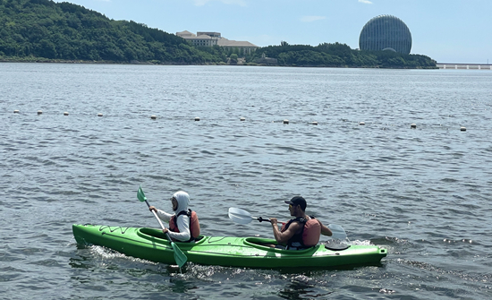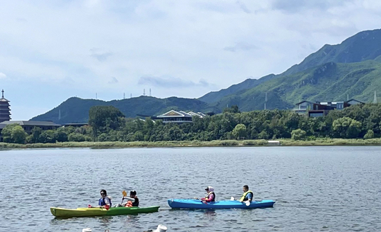 上午,雁栖湖水上运动基地组织体验皮划艇项目。大家仔细了解救生衣的正确穿戴、安全救助和基本划桨动作之后,在教练的协助之下两两一组进入皮划艇内,相互配合着划动双桨驶离码头,划向远处的湖面,充分体验这项运动的魅力。